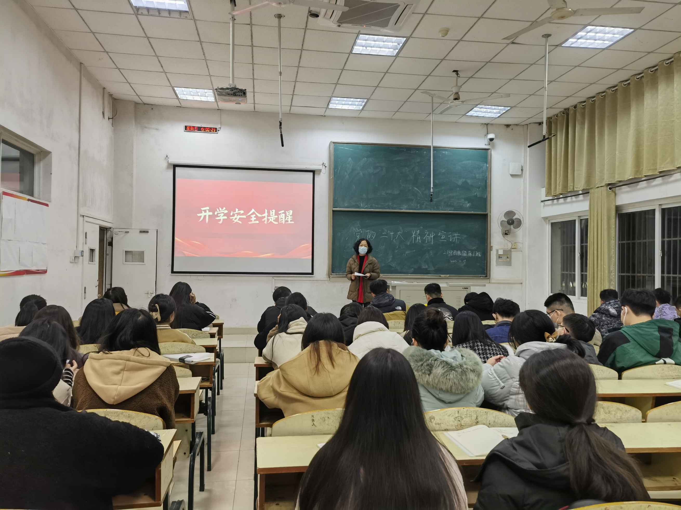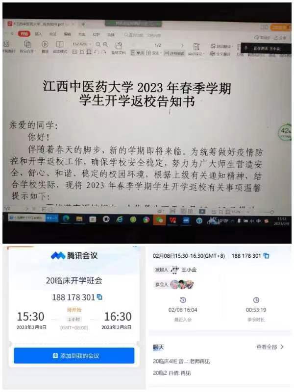 为确保学生如期、正常、安全开学,临床医学院根据《江西中医药大学2023年春季学期学生开学工作方案》《江西中医药大学2023年春季学期学生开学返校告知书》等方案要求,各年级辅导员组织召开线上春季返校主题班会,及时告知学生相关返校事项及安全知识。倡导同学们返校前开展7日内健康监测、要做好个人防护,鼓励有条件的学生乘坐私家车返校,符合条件的学生,完成疫苗第二剂次加强接种,做到“应接尽接”。同时,辅导员运用企业微信网络技术手段,精准掌握学生返校行程和健康状况。
