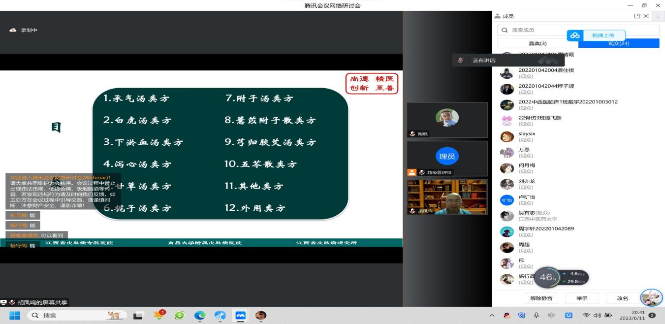 江中新闻网讯(通讯员 陶璐 刘泓岐)为拓展学术视野,营造浓厚的学术氛围。6月11日晚,由教务处主办,临床医学院承办的第七十三期云端中医大讲堂在腾讯会议平台进行线上直播。江西省皮肤病专科医院中西医结合科主任医师胡凤鸣做客本期讲堂。临床医学院、中医学院、针灸推拿学院、药学院等学院300余名师生在线参与了本次讲座。