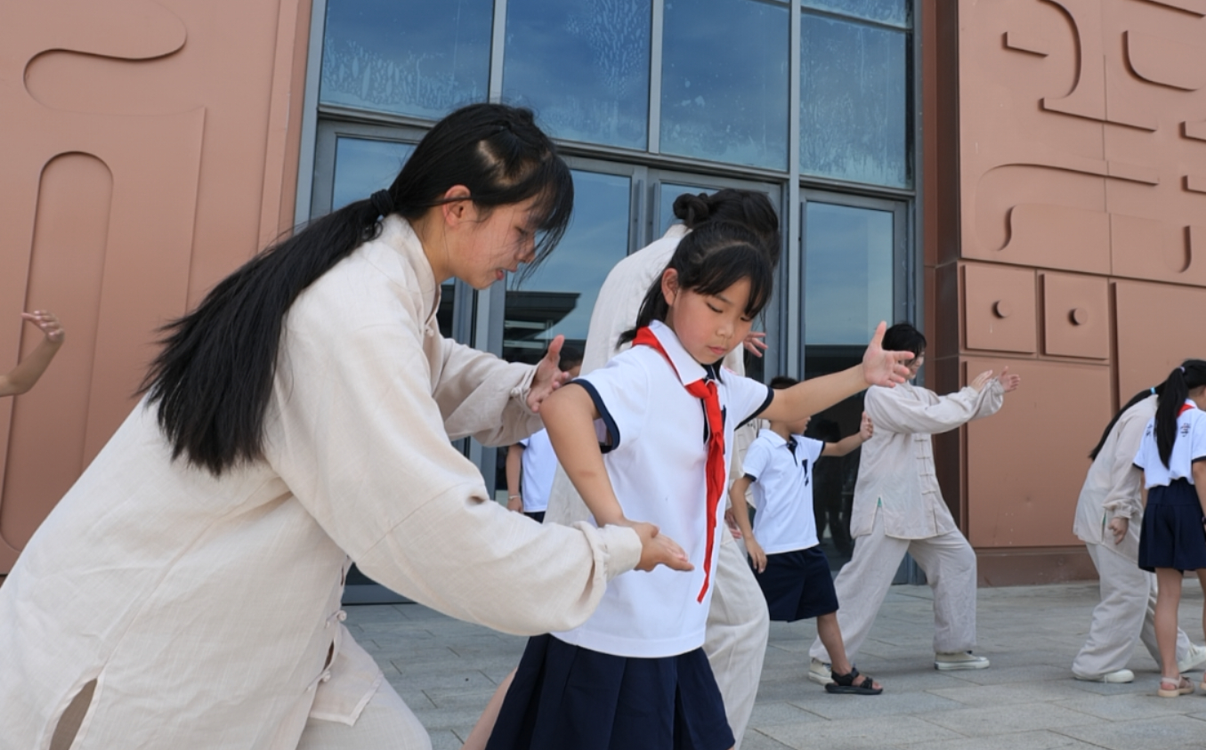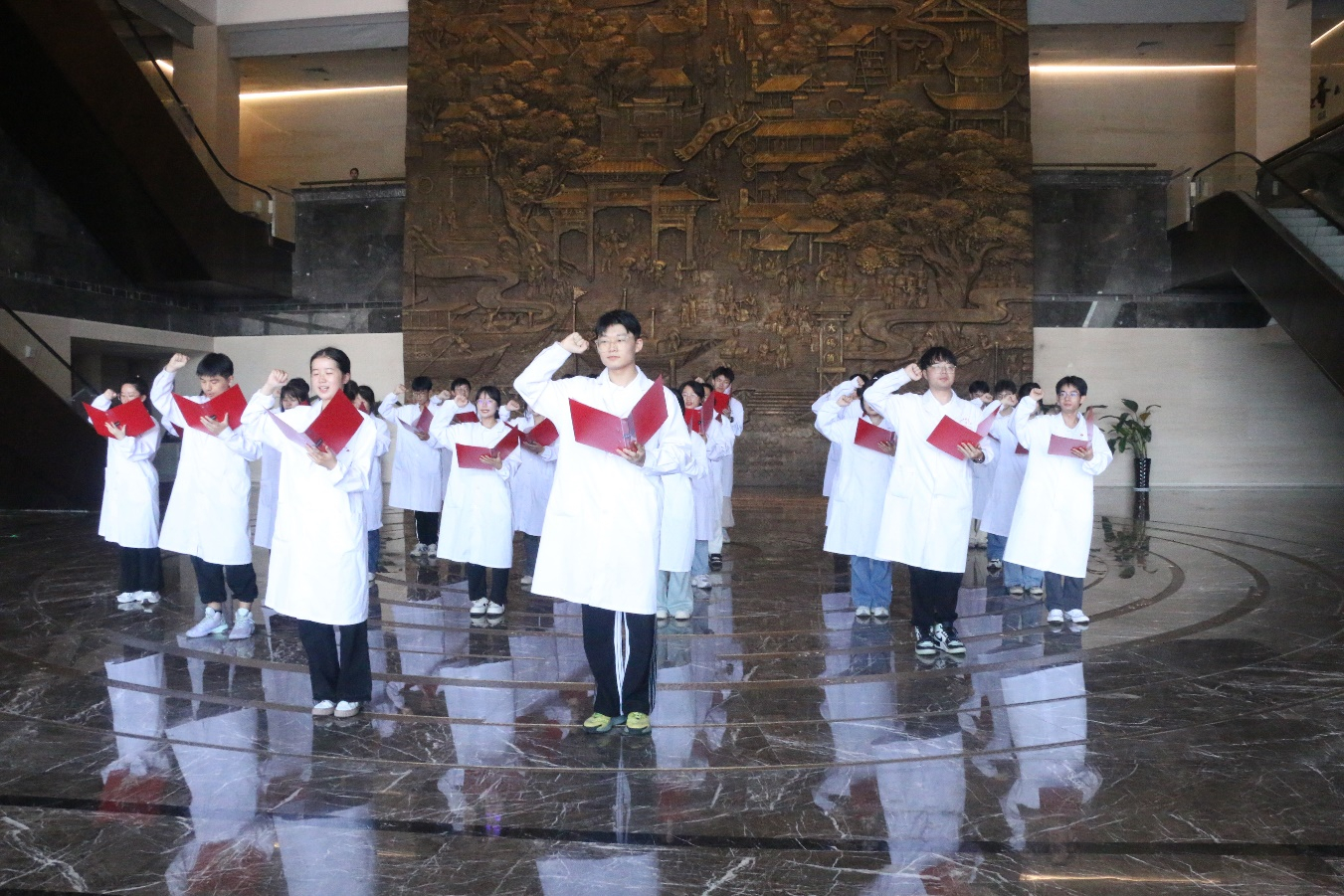 博览本草,承袭医脉。志愿者们来到樟树市岐黄小镇中国药都中医药博物馆,近距离领略国医之美与中药之奇,从中医药文化精髓、中医药发展史、樟帮中药炮制工艺等方面,全方位探寻中医药的深厚底蕴。服务队全体成员在馆内大厅进行了庄严的医学生宣誓,彰显杏林学子的使命担当。在先贤葛玄的巨型雕像前,志愿者们和樟树实验小学的小朋友一同练习太极功法、共同诵读《大医精诚》,一呼一吸之间感受传统功法的独特魅力,一字一句之间领悟医者仁心的深刻内涵,在青少年心中播撒下中医药文化和传统文化的种子。