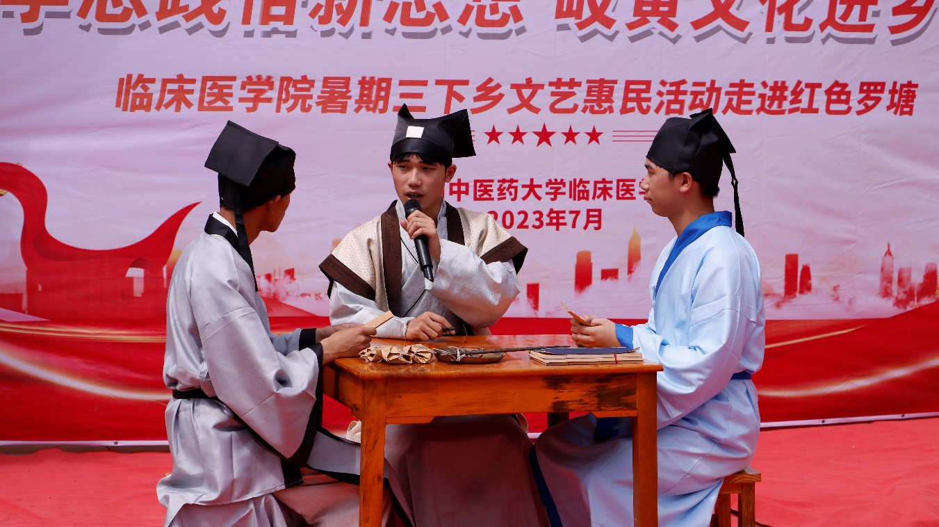 在革命先辈康克清同志的故乡——万安县罗塘乡,服务队以“学思践悟新思想 岐黄文化进乡村”为主题开展中医药文化进乡村文艺惠民活动,志愿者们通过歌舞、情景剧表演、经典诵读、太极拳功法展示等方式,向村民介绍中医辨证论原理、急救处理措施、中医养生保健知识等内容,使中医药文化以更直观生动的形式传播推广、入脑入心。