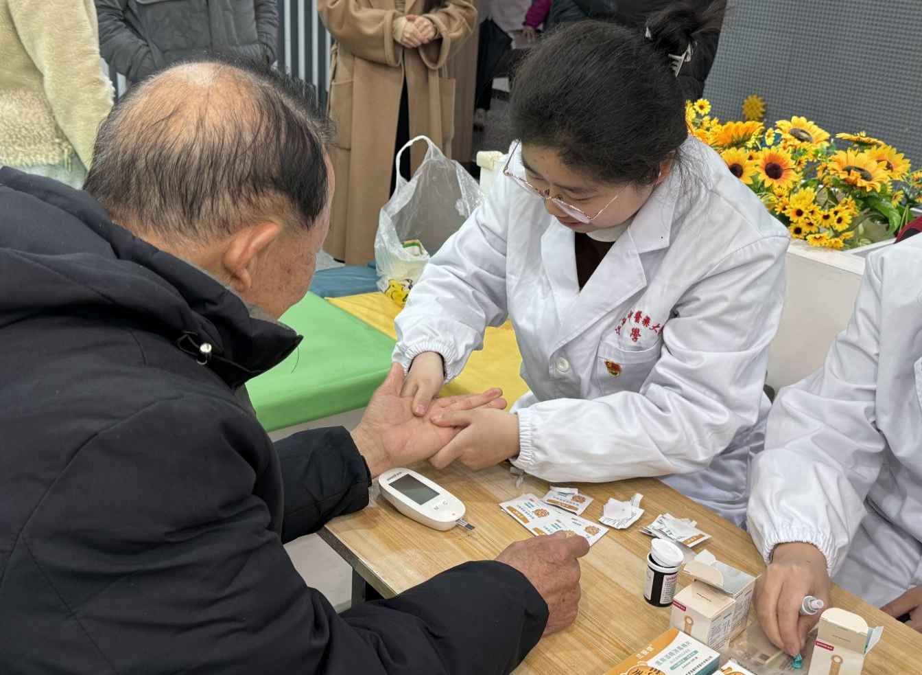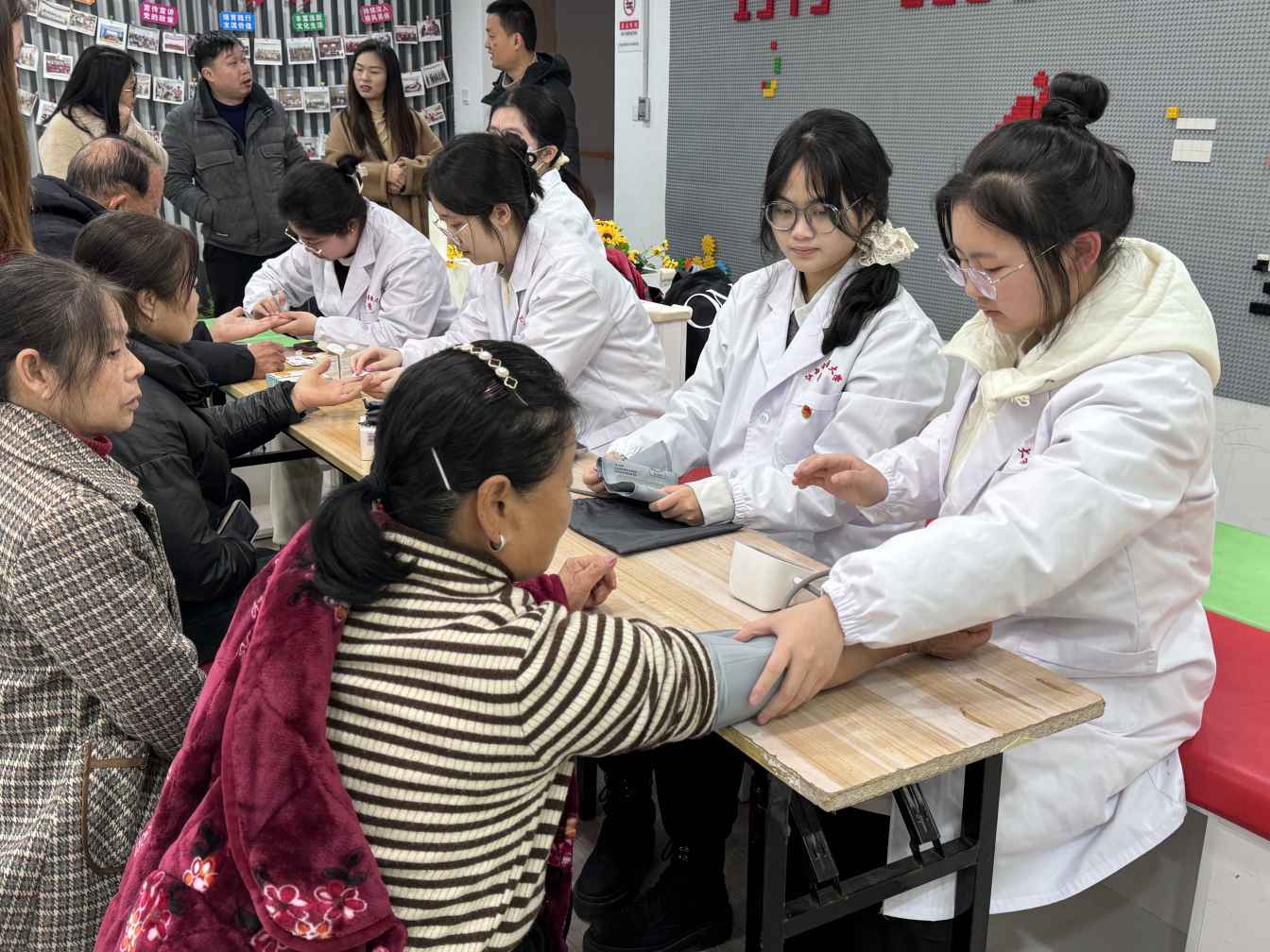 屋外春雨绵绵,九湾社区邻里中心的气氛却热烈非常。活动现场,学生党员志愿者们热情地为前来的社区居民提供免费的血压和血糖测量、推拿按摩以及艾灸等具有中医特色的医疗服务。同时,学生党员志愿者们也开设了问诊服务展台,耐心聆听社区居民的健康问题,并一一解答他们对养生保健的一些疑问,从生活习惯、日常饮食等方面给予健康指导。