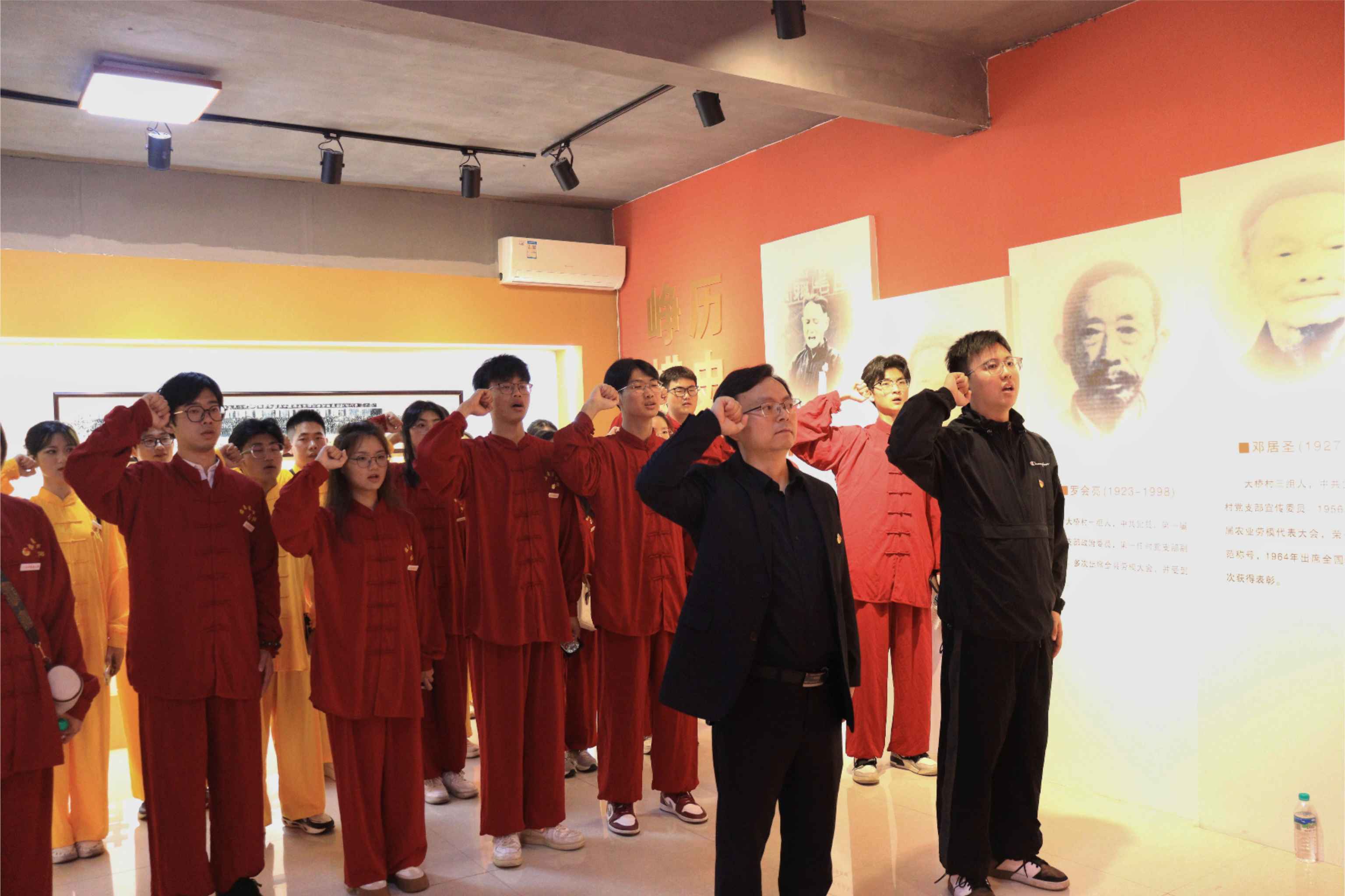 “艰苦奋斗十二年,穷乡僻壤面貌新。”走过六百平方米的展馆,通过馆内陈列的图片、报刊及音像等资料,讲解员用“四个第一开创先河”和“七个章节”向我院师生详细介绍了胡华先与妻子陈金香带领村民开荒拓地、改良土壤、为党献身的故事,阐述了铁肩膀精神的深刻内涵。随后,学生党员和学生骨干们参观了馆内农业水利机关站都会遗址及毛主席接见胡华先同志、县委召开全县棉花技术现场会等历史照片,进一步增强了同学们对历史事件的认同感和情感共鸣,体会历史与今时的交叠碰撞。紧接着,全体学生党员和骨干一起重温入党誓词,强化责任担当意识。
