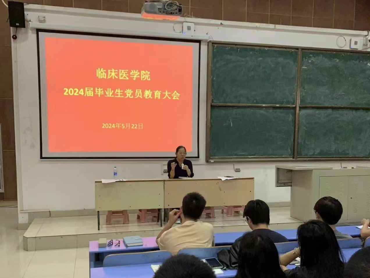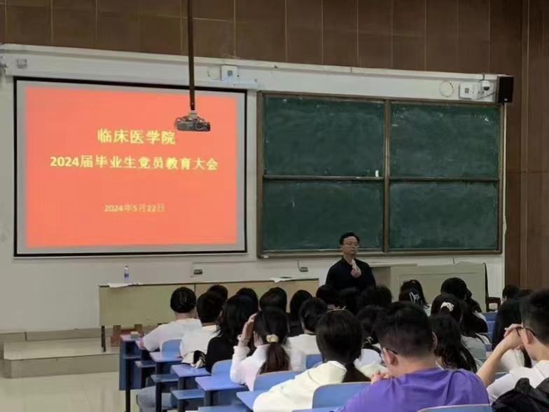 为加强毕业生党员教育,提高毕业生党员党性意识和组织观念,充分发挥毕业生党员的先锋模范作用,5月22日,临床医学院于知行楼T2教室举办2024届毕业生党员教育大会。临床医学院党委副书记、副院长邹浪、临床医学院组织员熊哲、临床医学院办公室副主任黄鑫及毕业班辅导员出席会议,临床医学院全体2024届毕业生党员参加会议。
