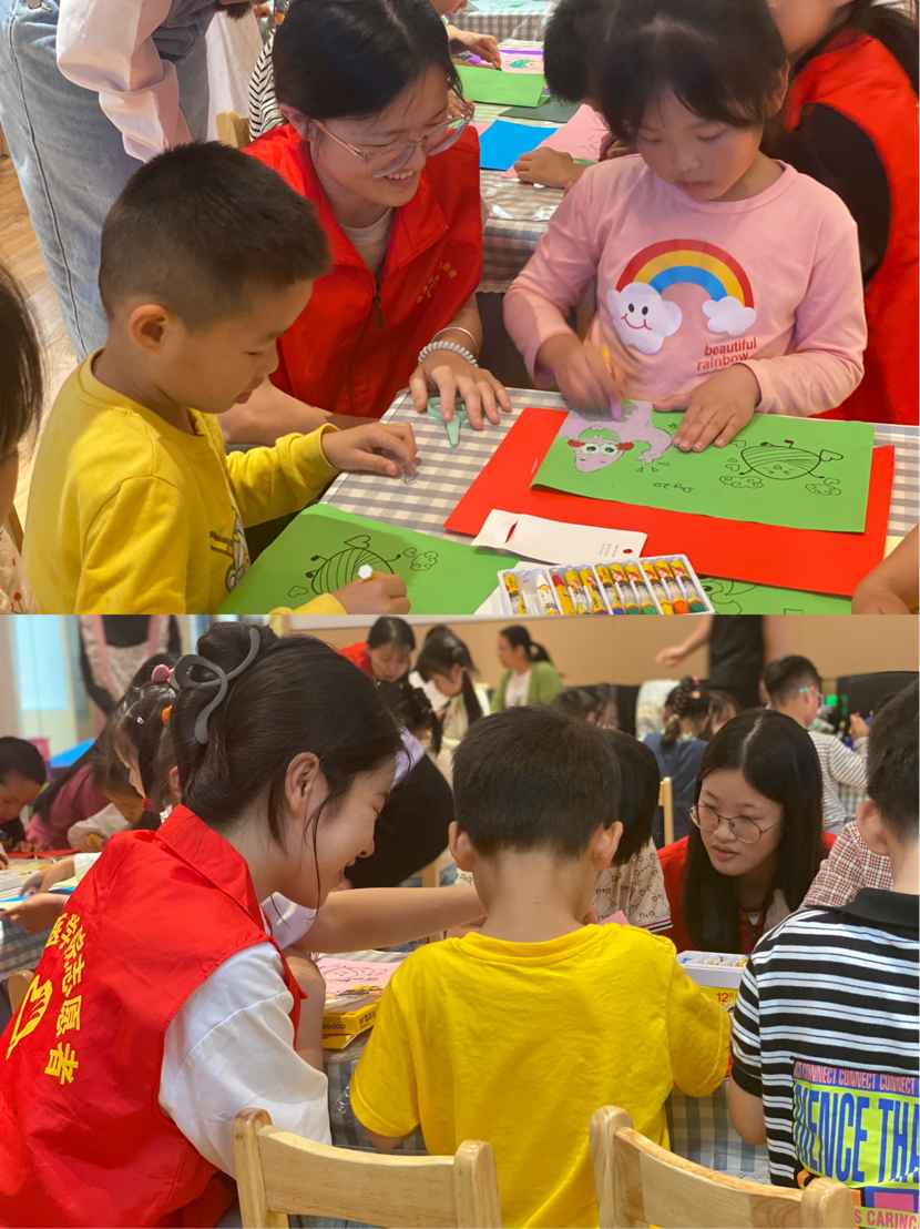 活动伊始,学生党员志愿者们通过讲故事的方式,向孩子们讲述了端午节的文化背景、起源、民俗活动以及伟大诗人屈原的故事。随后,学生党员志愿者们携手小朋友们一起制作创意粽子画和手工团扇,带领孩子们感受中华文化的魅力。孩子们利用手中的画笔和卡纸发挥着自己的奇思妙想,描绘着心中的粽子模样。“这里是粉色,这里是蓝色,这里是绿色。”孩子们边画边交流,在欢声笑语中展示着自己的创作。此外,学生党员志愿者们还特别为小朋友们准备了一场精彩的“庆端午”手势舞,小朋友们热情高潮,跟着音乐节奏拍起小手,现场气氛浓烈。