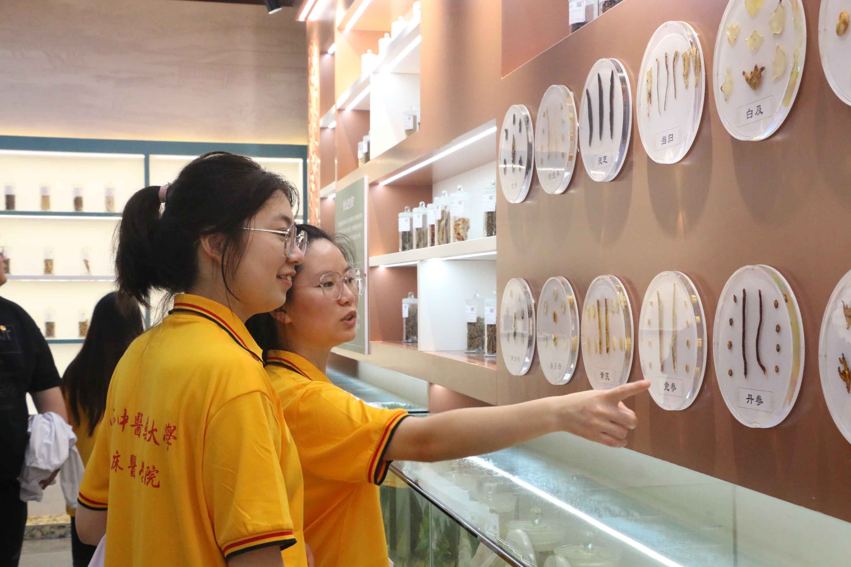 在中医药科普馆里,队员们近距离观察中草药标本,观看其产地、性味、功效的介绍。桂枝汤、半夏白术天麻汤、小柴胡汤……队员们相互提问方剂名字,根据名字说出药物组成,巩固所学知识。