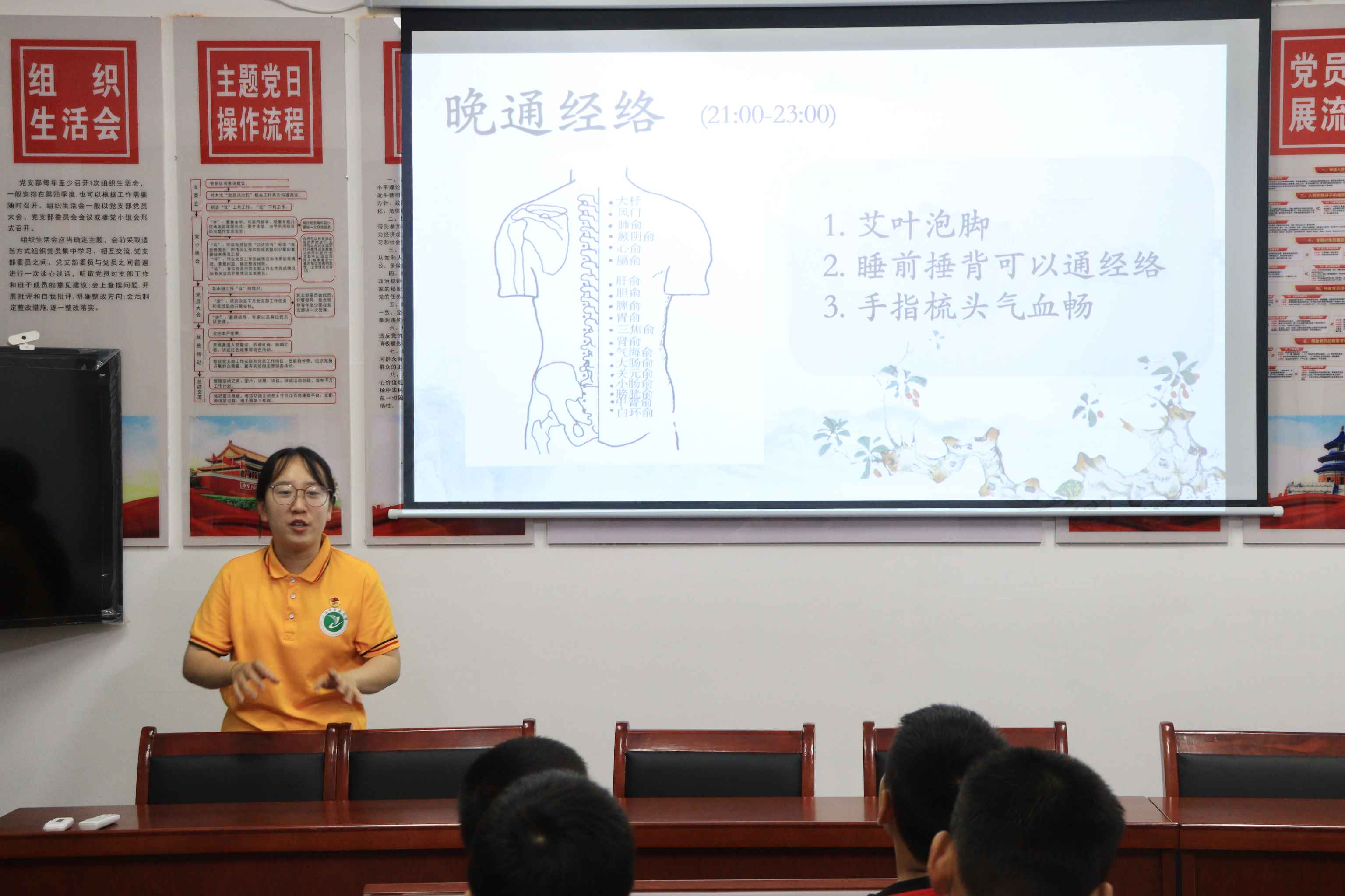 “这个是劳宫穴,将手握拳,中指就点掌心,这就是劳宫穴的位置。经常按压可以强壮心脏……”实践队员们结合图片,通俗易懂地向大家科普了早养脾胃、午养心、晚通经络以及暑有三避三忌三宜等中医养生知识,并在结束后邀请小朋友们用普通话总结学习的养生知识并纠正其发音,借助宣讲中医养生知识进一步推广普通话,培养孩子们讲普通话的意识。