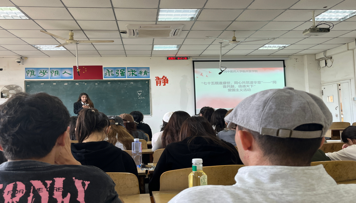 在这个金秋送爽、硕果累累的季节,10月2日,临床医学院于劝学楼5311隆重举办了以“七十五载逢盛世,同心共筑谱华章——同音共融,语通天下”为主题的爱国主义教育活动。