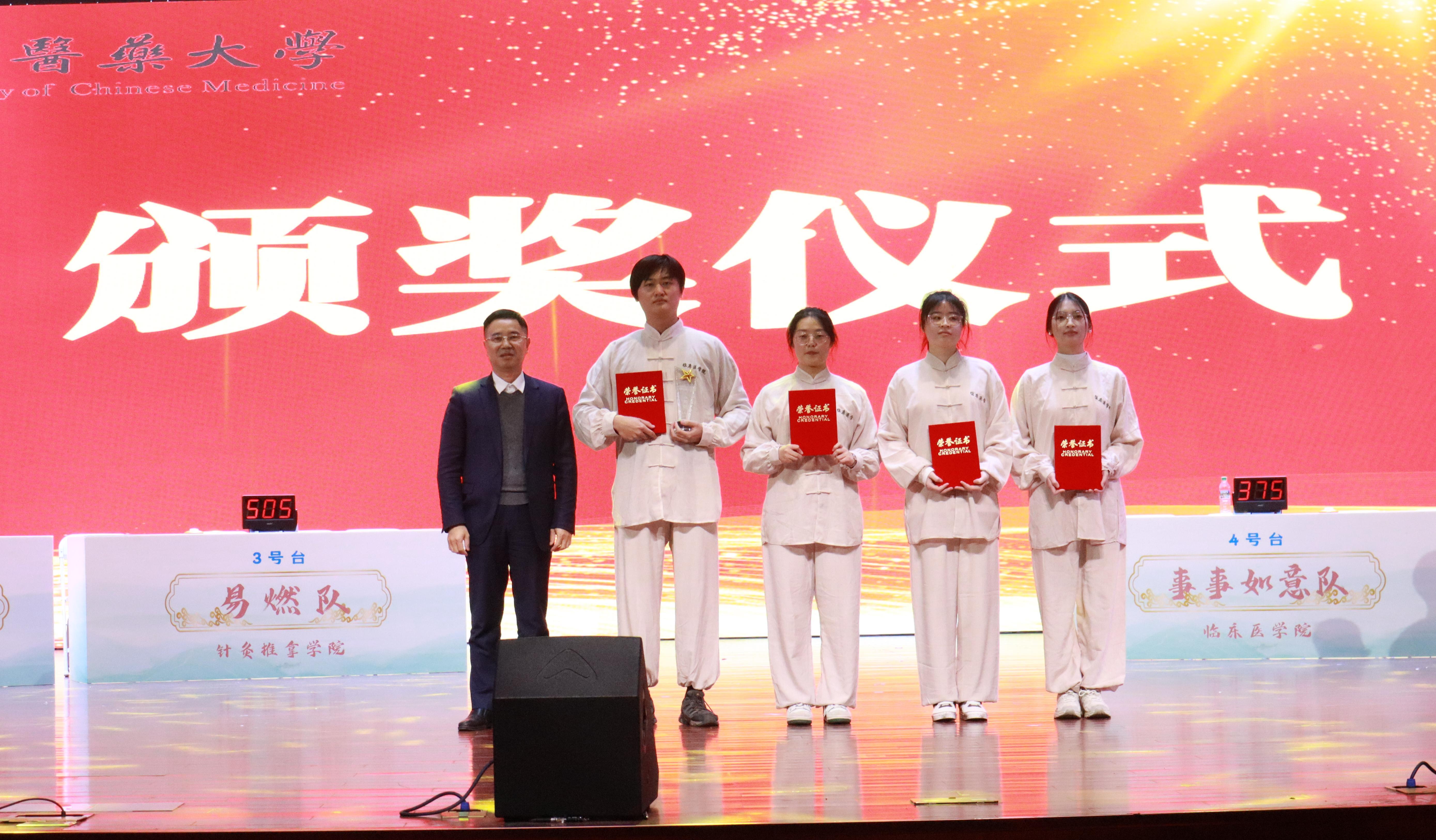 经过激烈比拼,临床医学院“输赢都去开派队”荣获一等奖,针灸推拿学院“易燃队”、临床医学院“青衣养生队”荣获二等奖,临床医学院“事事如意队”、岐黄国医书院“好运连连队”、临床医学院“尽量答队”荣获三等奖。