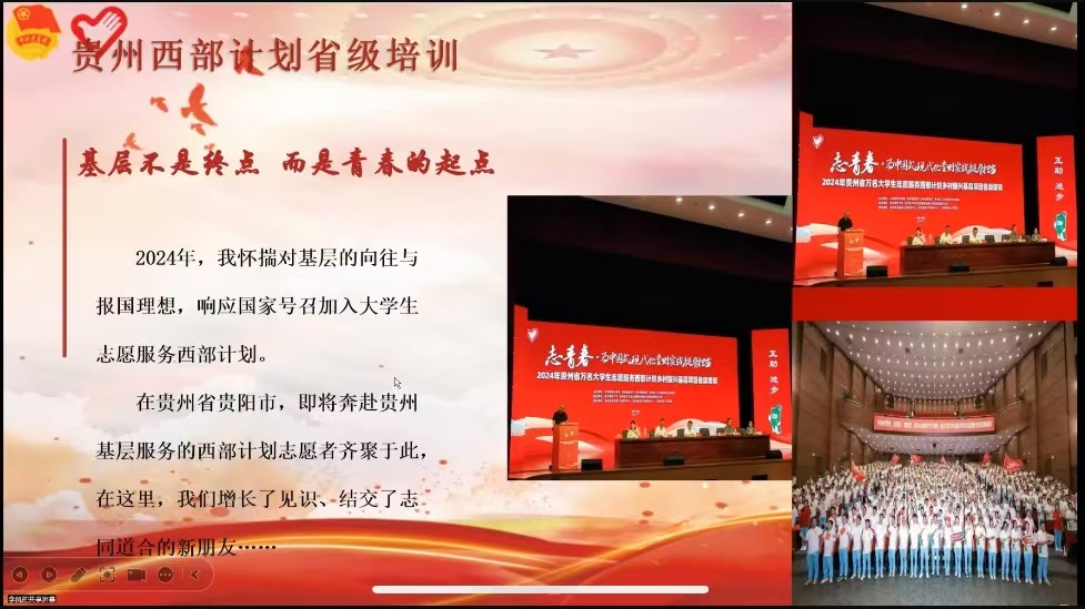 三名志愿者分别服务于贵州织金县、新疆特克斯县和江西省宜丰县。他们从自身实践出发,围绕政策解读、服务日常和成长感悟等方面展开分享。会上,志愿者们详细讲述了西部基层的工作环境和医疗帮扶等具体服务内容。同时,他们重点针对西部计划的政策保障和报名流程等同学们所关心的问题,进行了耐心解答。最后,志愿者们强调,参与西部计划不仅是青年学子践行“听党话、跟党走”的具体行动,更是将理论学习与社会实践相结合的重要途径。