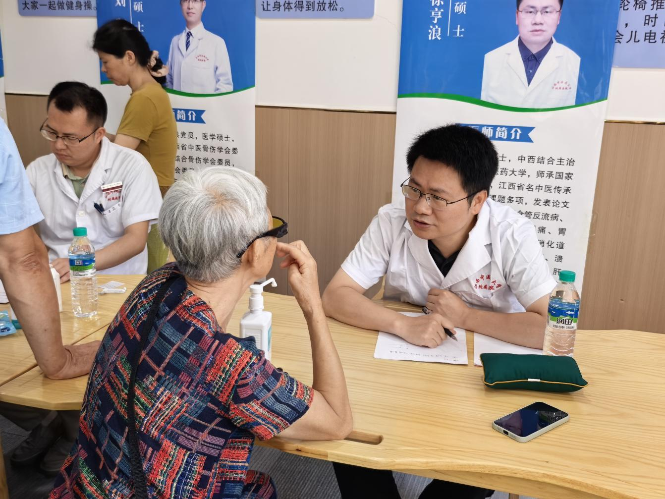 医生的手指静静地搭在居民的手挽上,仔细地辨别脉象。“你有哪里感觉不舒服吗?”“医生我感觉腰这里经常会痛。”在长天松康乐平颐养中心和洎阳街道天湖社区的活动室,居民们陆陆续续前来问诊。江西中医药大学附属医院的三名专家为居民们提供中医骨科、心血管内科和消化科等方面疾病的专业诊疗服务。“医生,扎完针之后,现在我感觉好多了,腰那里没那么痛了。”专家们运用望闻问切的方法进行诊断,并提供治疗建议和针灸疗法,耐心地回答居民们的疑问,给出最适宜的回答。