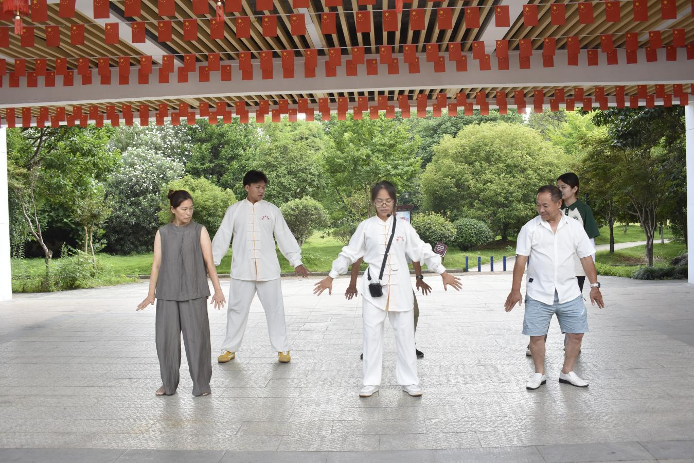 “奶奶,这个动作的手势是这样的。”在长天松康乐平颐养中心和洎阳街道天湖社区户外空地上,实践队员们手把手地教导居民们学习传统功法八段锦和太极拳。“左右弯弓似射雕,这个动作是模仿拉弓的动作,所以双手需要张开。”实践队员们细致地为居民们讲解每个动作的要点,逐一进行示范。在悠扬的音乐中,实践队员与居民们共同感受传统功法的韵律与力量。