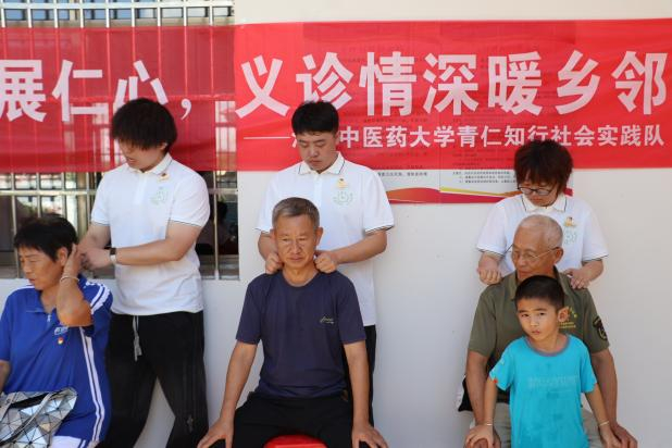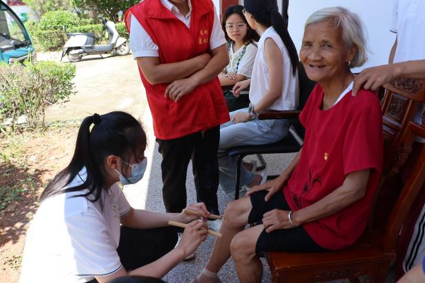江西中医药大学 “青仁知行” 社会实践队联合校附属医院心血管科、脾胃肝胆病科、糖尿病科、骨科等科室专家医生深入南昌市安义县长均乡天坪村、长埠镇江下村及龙津镇东门社区开展暑期“三下乡”义诊活动。队员们针对居民百姓的身体健康状况深入展开调研,耐心详细的了解和摸排居民身体状况和就医情况,医生们带领队员们针对性地指导居民患者用药就医,通过测腰围、体重、血压、血糖、听诊、脉诊、舌诊等多形式了解居民身体情况,向他们分享“三高”、糖尿病、肝脏疾病以及颈椎病等中老年人常见病症的防范与治疗措施,同时,通过艾灸、推拿、八段锦教学等形式做好中医药文化的推广和科普,提高居民身体素质,将优质医疗资源送到村民家门口,切实解决乡村群众健康需求问题。“在家门口就能享受到省里医院专家的服务和学生娃们的热情帮助,还能学点强身健体的本事,真是太好了!”一位刚体验完推拿的村民高兴地表示。乡民们的信任期盼和对健康的渴望让队员们更加地了解到健康服务乡村的重要价值和意义所在。