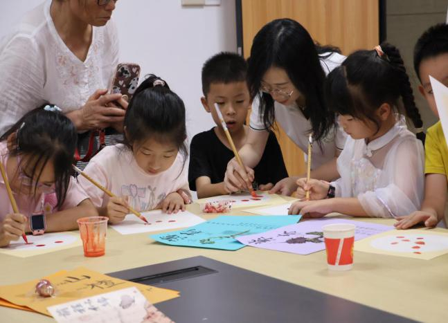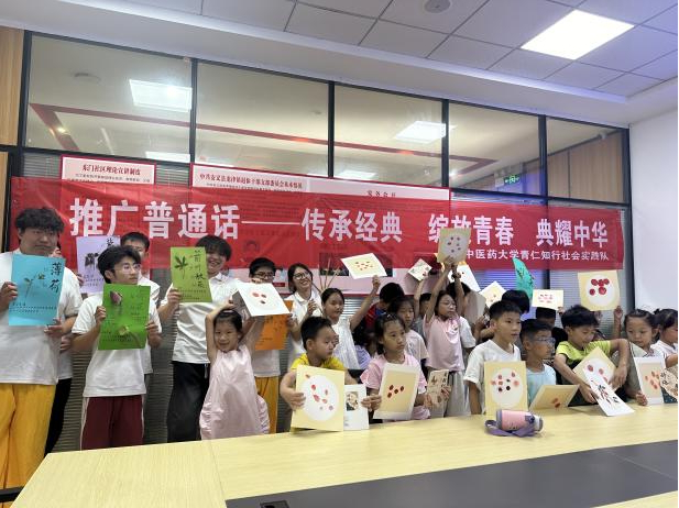 “大家看,这种叶子具有特殊提神作用,闻上去有清凉的香气,这种草是我们生活中常用到的一味药,是不是已经猜到啦,这株草药是读bòhé还是bò he呢”,服务队队长黄嘉琦拿着普通话美育展示卡和薄荷植株在向社区的孩子们认真讲解中草药知识。“薄荷糖就是用这种薄荷做的吗?”孩子们的提问和童趣围绕着整个课堂。青仁知行服务队队员们在龙津镇东门社区开设的以“中医药+美育+推普”三位一体的新形式宣讲课堂,这一宣讲形式,收到了孩子们和家长的一致认可和好评。主讲人以实物、绘画、普通话、规范字相结合,通过实物望闻摸、普通话纠正、规范字笔顺正确书写、中草药国画教学融合一体,为儿童们开启中医药启蒙之门,带来一场高质量的“中医药+推普”美育课堂,提高社区儿童的中医药文化认知水平和审美与人文素养。