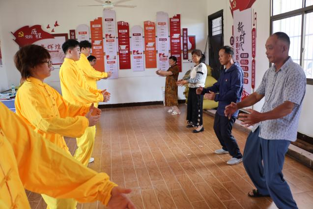 在功法教学区,队员带领村民练习八段锦。队员们先示范标准动作,再逐句讲解口诀含义,遇到年纪大、学得慢的村民,便一对一纠正姿势。医生和学生们现场教授村民们练习太极拳、八段锦等经典养生功法。此间的一招一式,如行云流水一般,不仅传授了强身健体的方法,更在潜移默化中传播了源远流长的中医药文化和养生智慧。队员们教得认真,村民们学得投入,现场气氛融洽热烈。