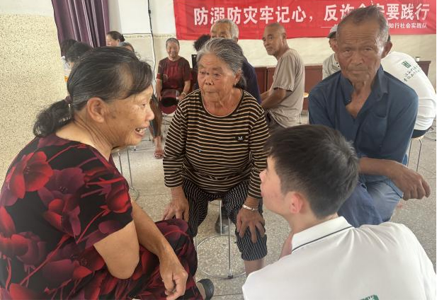 青仁知行服务队队员在江下村礼堂深入开展防溺水、防火灾、防诈骗等安全教育宣讲活动,将实用安全知识与应急技能带进乡村,与村民携手共筑安全意识之基。针对溺水、火灾、诈骗等安全隐患问题时,队员肖梦茜结合真实案例警示村民,强调生命安全放在首位理念,向村民们介绍自救和互救方法,提高村民防灾减灾救灾能力。讲到中医急救疗法时,宣讲员指着自己的脐中部说到:“我们的肚脐中央有一个叫做神阙的穴位,当有人溺水时,可以在紧急抢救后用艾灸的方式温熏这个部位,有助于溺水者的恢复。”最后,宣讲员带领村民们齐读安全准则,提升村民安全防范意识,筑牢安全防线。