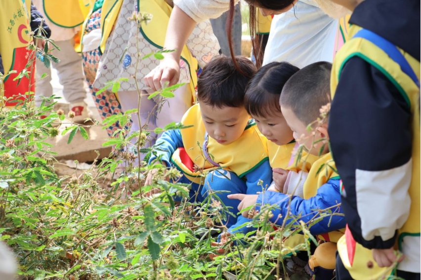 随后,孩子们来到学校“神农园”,走入园中,缓缓映入眼帘的是神农雕像广场上功法队队员们的八段锦表演——动作刚柔并济、行云流水,引得孩子们好奇围观,纷纷上前模仿比划。志愿者为小朋友开展“眼看手勿动,鼻闻嘴不尝”的安全理念教育,在志愿者的引导下观察草药形态、轻嗅气味、触摸质感,亲手触摸薄荷、含羞草等,感受自然与医药的奇妙联结。幼儿园带队老师感慨:“这样的体验让中医药文化‘活’了起来,孩子们在游玩中理解了传统文化的价值。”
