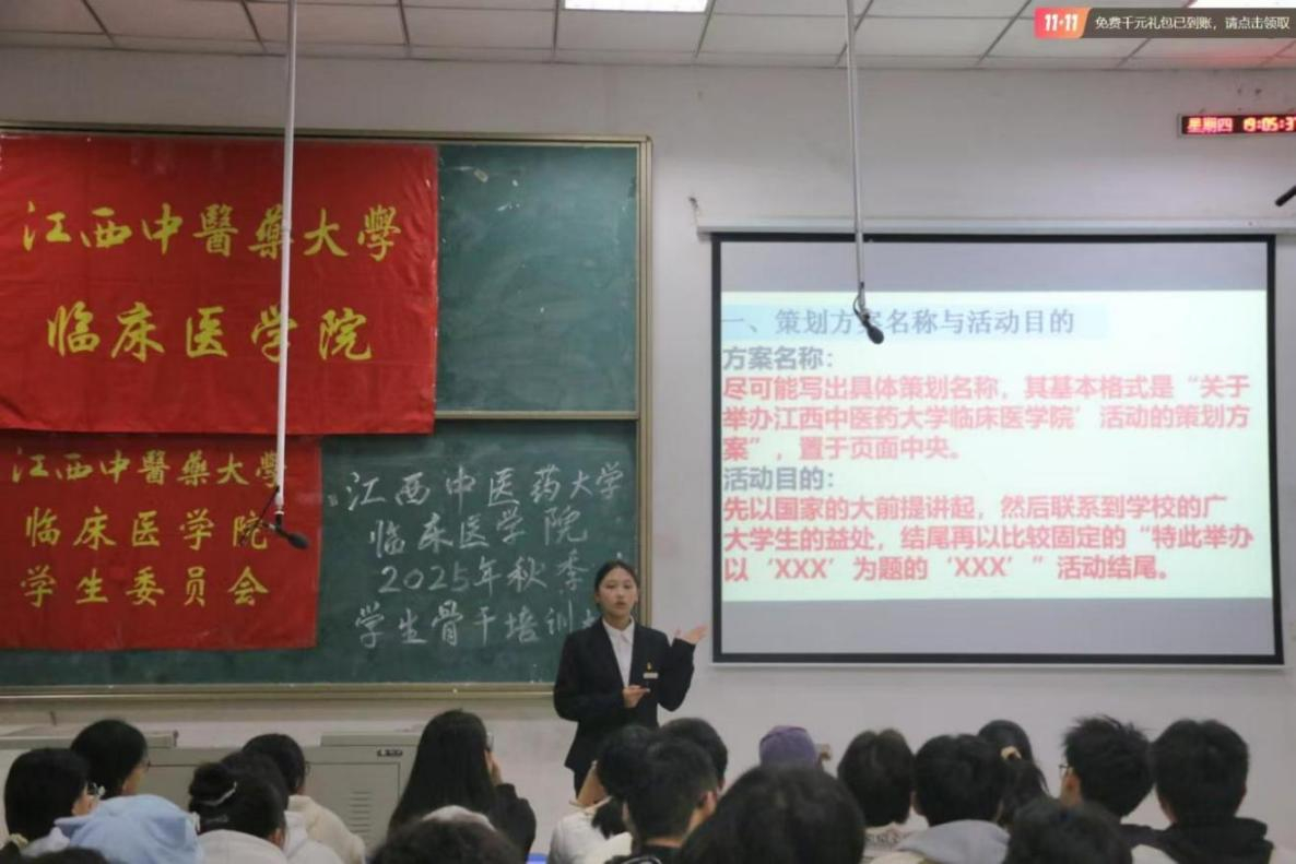 为深入学习贯彻党的二十届四中全会精神,培养有理想、敢担当、能吃苦、肯奋斗的新时代好青年,11月6日晚,临床医学院于T5-2和5112教室召开2025年秋季学生骨干培训大会,临床医学院全体学生骨干参与此次培训。