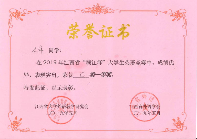 汪洋获江西省“赣江杯”大学生英语口语竞赛C类一等奖