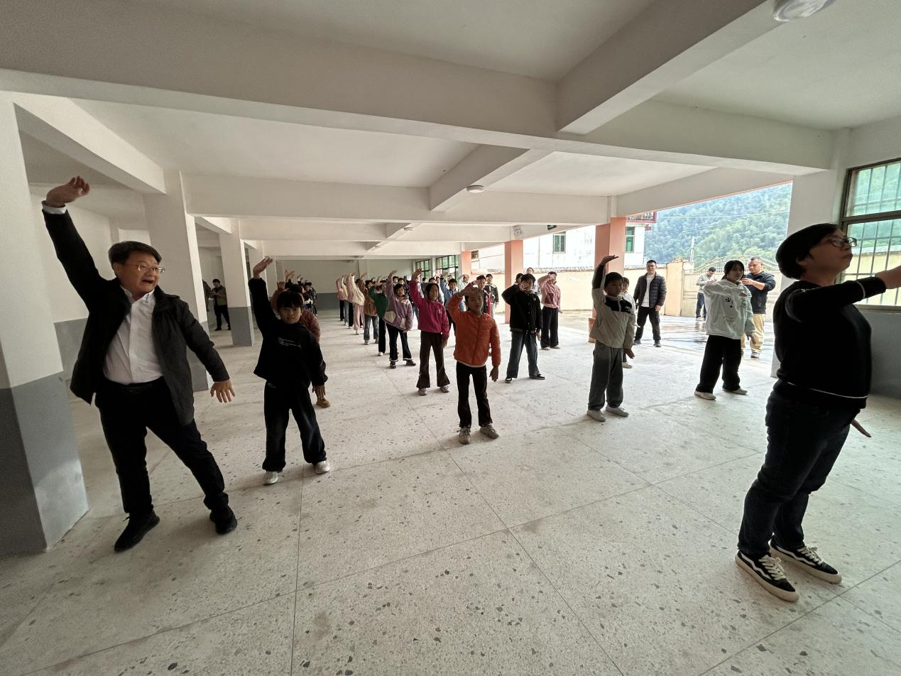 (机关后勤第三支部党员胡春媚带领学生打“八段锦”)