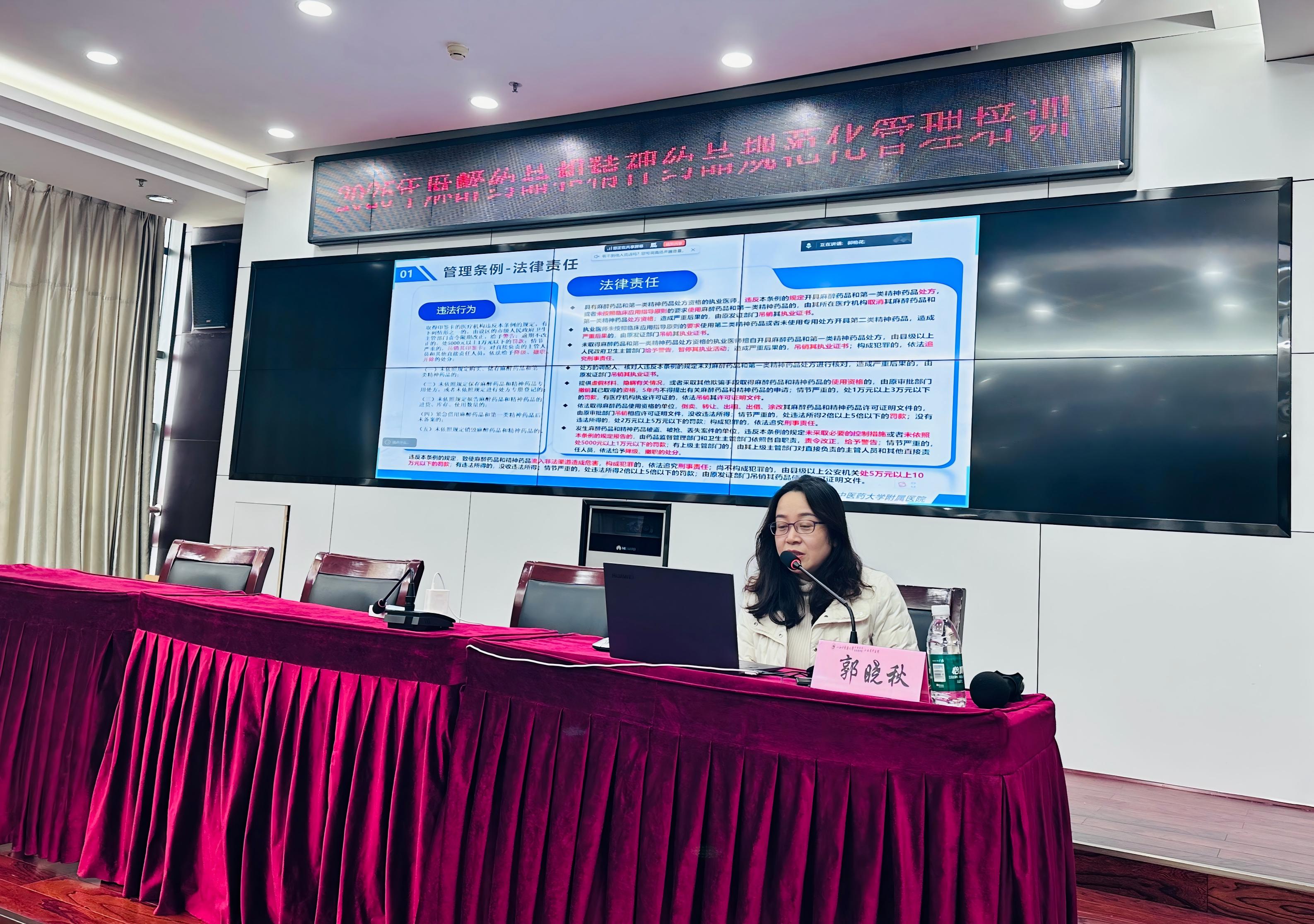 本次培训特别邀请了院外专家进行前沿指导:江西省儿童医院余晓耕主任深入解读了医疗机构麻精药品规范化管理体系;南昌大学第一附属医院欧阳爱军主任系统讲授了麻醉药品临床应用的精细化管控要点。同时,发挥了我院内部专家的实践引领作用:药学部邓红老师结合我院实际,详细讲解了医院精麻药品管理的制度流程与注意事项;药学部郭晓秋主任则从法律法规角度,深入剖析了麻精药品管理的“红线”要求与临床使用的“底线”原则。