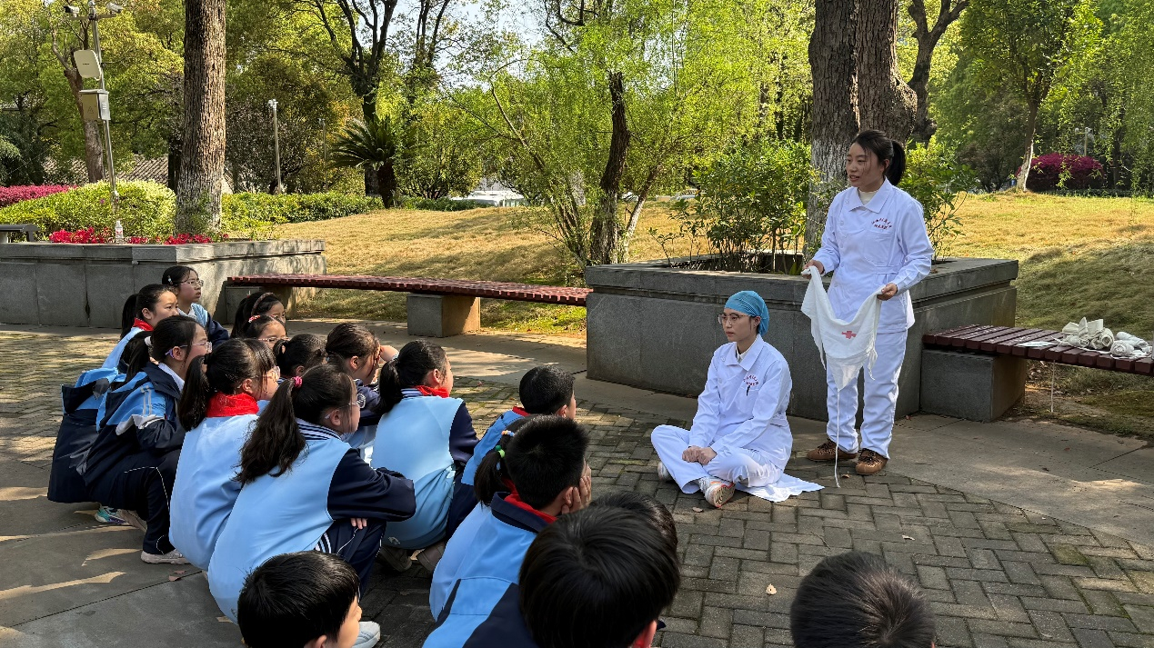 为将红色教育与生命教育深度融合,活动特别设置了急救知识科普环节。来自江西中医药大学附属医院的医护党员们,结合小学生的认知特点,用通俗易懂的语言、生动直观的演示,向孩子们讲解了创伤包扎、止血等实用急救技能。医护人员手持红十字三角巾,手把手示范操作要点,孩子们认真聆听、积极互动,在实践中掌握了自救互救的本领,深刻体会到生命的可贵与医护人员救死扶伤的职业精神。