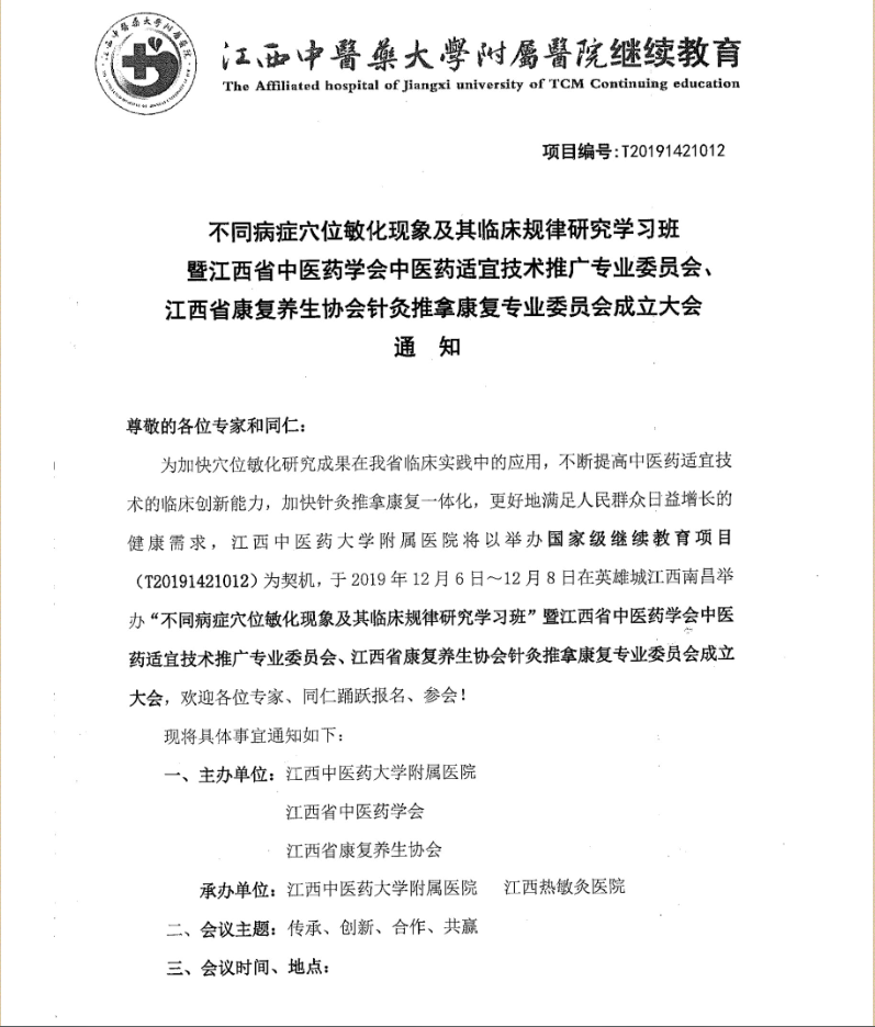 不同病症穴位敏化现象及其临床规律研究学习班暨江西省中医药学会中医药适应技术推广专业委员会、江西省康复养生协会针灸推拿康复专业委员会成立大会