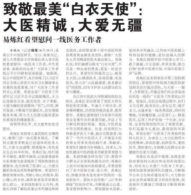 【江西日报】致敬最美“白衣天使”:大医精诚,大爱无疆 易炼红看望慰问一线医务工作者