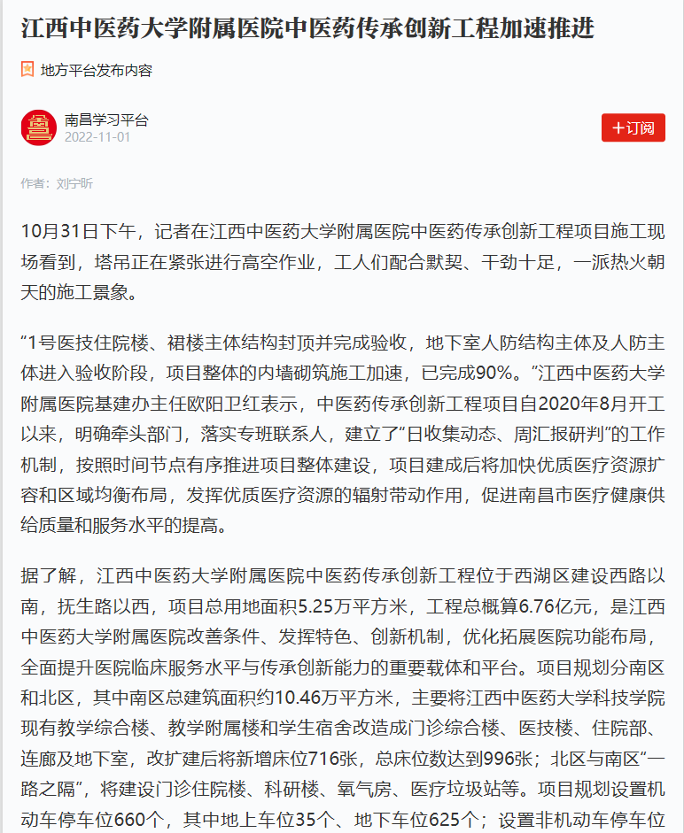 “1号医技住院楼、裙楼主体结构封顶并完成验收,地下室人防结构主体及人防主体进入验收阶段,项目整体的内墙砌筑施工加速,已完成90%。”江西中医药大学附属医院基建办主任欧阳卫红表示,中医药传承创新工程项目自2020年8月开工以来,明确牵头部门,落实专班联系人,建立了“日收集动态、周汇报研判”的工作机制,按照时间节点有序推进项目整体建设,项目建成后将加快优质医疗资源扩容和区域均衡布局,发挥优质医疗资源的辐射带动作用,促进南昌市医疗健康供给质量和服务水平的提高。