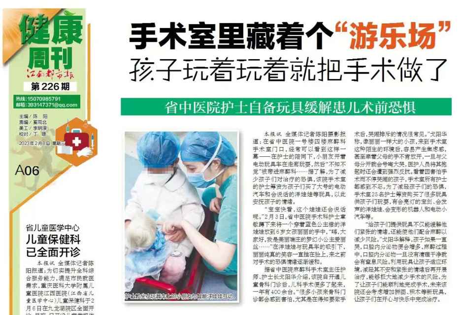2月3日,江西中医药大学附属医院(以下简称省中医院)一号楼四楼麻醉科手术室出现一幕温馨的画面——一名6岁的小女孩在护士的陪同下,开着一辆红色的玩具车在走廊上玩耍。原来,孩子们在手术前常常因为害怕哭闹。为了减少孩子们对治疗的恐惧,手术室的护士们一起筹资为他们买了大号的电动汽车、会说话的洋娃娃等玩具,把他们当做自己孩子一样一起玩耍,耐心地安抚他们的情绪。