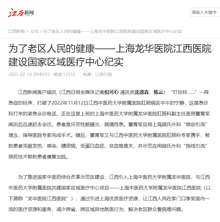 为了推进国家中医药综合改革示范区建设,江西引入上海中医药大学附属龙华医院,与江西中医药大学附属医院共建国家区域医疗中心项目——上海中医药大学附属龙华医院江西医院(以下简称“龙华医院江西医院”),通过引进上海优质医疗资源,让江西人民在家门口享受国内一流的医疗资源和服务,减少跨省、跨区域异地就医行为,解决老区群众看病难问题。