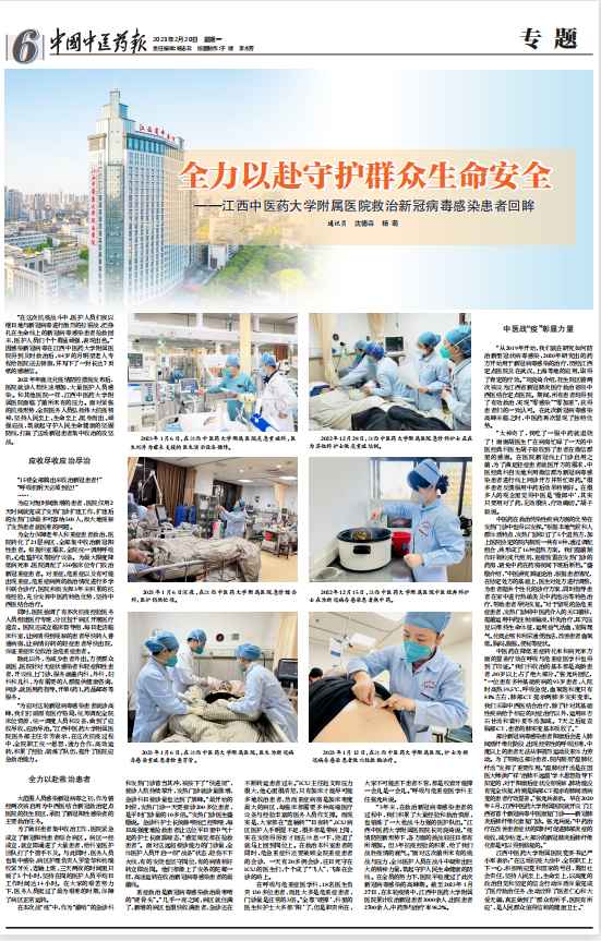 “3年来,在救治新冠病毒感染患者的过程中,我们积累了大量经验和救治资源,也锻炼了一大批战斗力强的医护队伍。”江西中医药大学附属医院院长刘良徛说,“疫情防控新形势下,各方面的挑战较往日都有所增加。但3年抗疫经验的积累,给了我们战胜疫情的底气。”面对这次前所未有的挑战与压力,全体医护人员在战斗中凝聚出巨大的精神力量,筑起守护人民生命健康的防线。在全员的努力下,医院平稳度过了此次新冠病毒感染的高峰期。截至2023年1月27日,在本轮疫情中,江西中医药大学附属医院累计收治新冠患者3000余人,出院患者2700余人,中药参与治疗率98.2%。