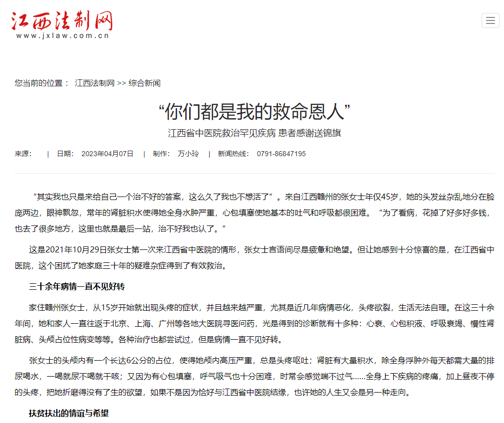【江西法制网】 “你们都是我的救命恩人” 江西省中医院救治罕见疾病 患者感谢送锦旗
