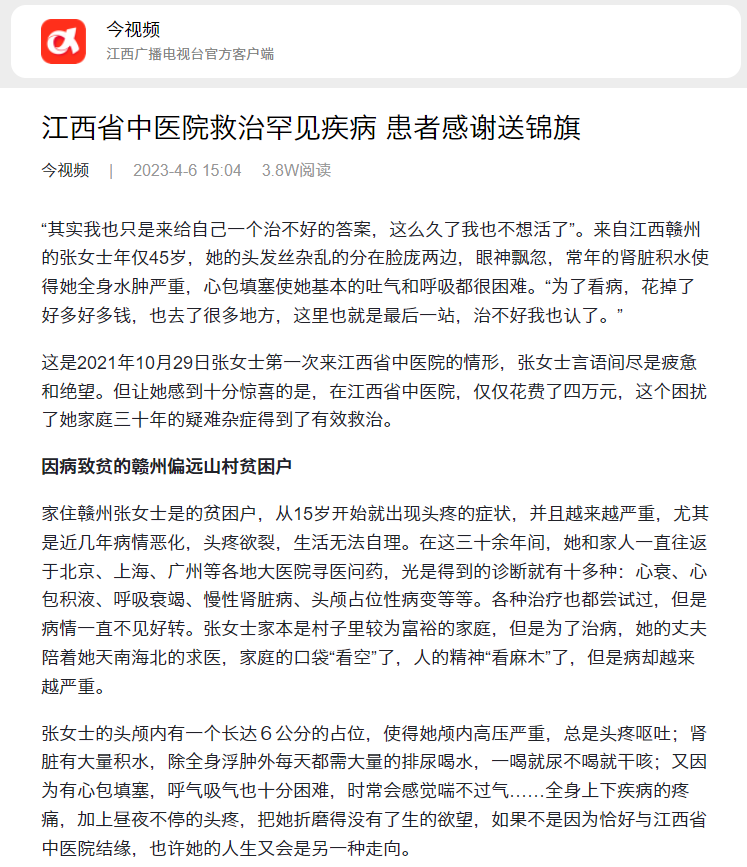 张女士的头颅内有一个长达6公分的占位,使得她颅内高压严重,总是头疼呕吐;肾脏有大量积水,除全身浮肿外每天都需大量的排尿喝水,一喝就尿不喝就干咳;又因为有心包填塞,呼气吸气也十分困难,时常会感觉喘不过气……全身上下疾病的疼痛,加上昼夜不停的头疼,把她折磨得没有了生的欲望,如果不是因为恰好与江西省中医院结缘,也许她的人生又会是另一种走向。