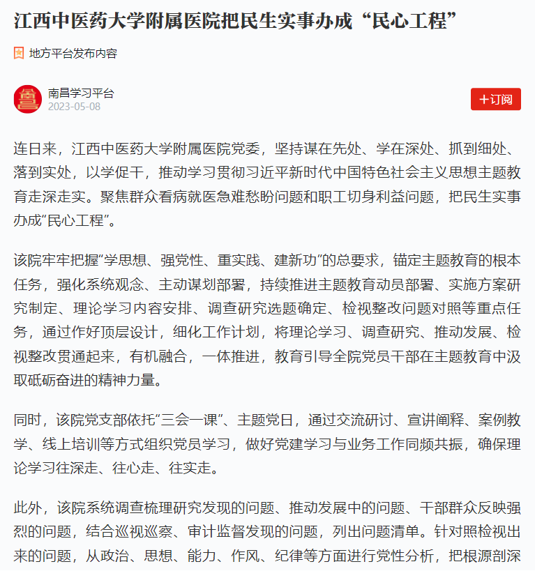 连日来,江西中医药大学附属医院党委,坚持谋在先处、学在深处、抓到细处、落到实处,以学促干,推动学习贯彻习近平新时代中国特色社会主义思想主题教育走深走实。聚焦群众看病就医急难愁盼问题和职工切身利益问题,把民生实事办成“民心工程”。