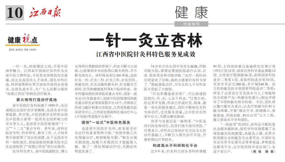 【江西日报】一针一灸立杏林 江西省中医院针灸科特色服务见成效