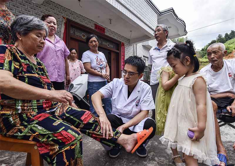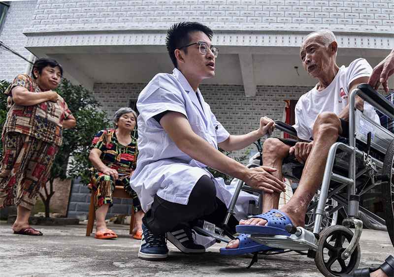 8月27日,江西省中医药大学附属医院康复科主治医师在抚州市资溪县鹤城镇下长兴村为中风患者做康复治疗。