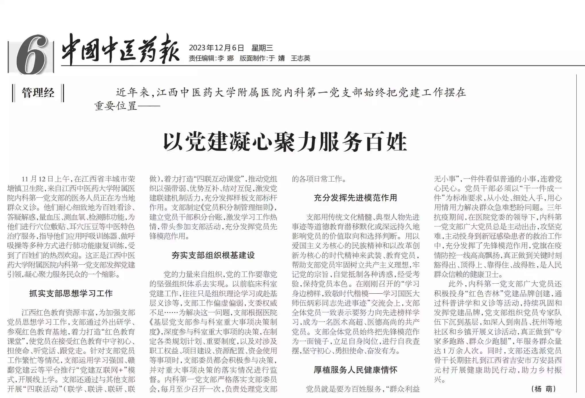 近年来,江西中医药大学附属医院内科第一党支部始终把党建工作摆在重要位置——