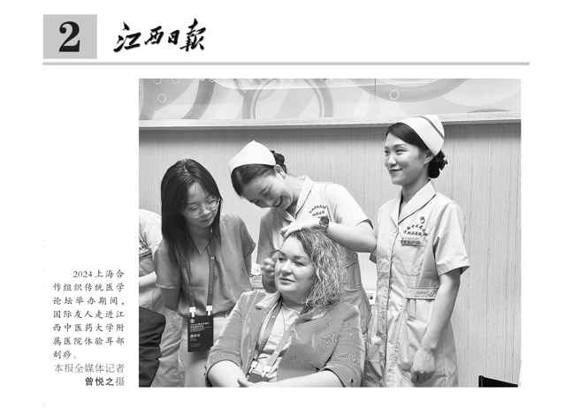 2024上海合作组织传统医学论坛举办期间,国际友人走进江西中医药大学附属医院体验耳部刮痧。