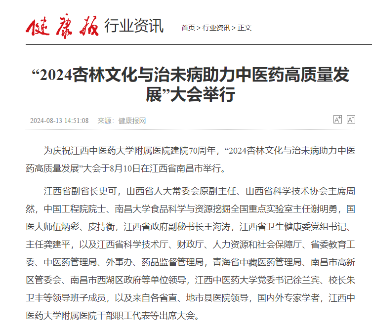 为庆祝江西中医药大学附属医院建院70周年,“2024杏林文化与治未病助力中医药高质量发展”大会于8月10日在江西省南昌市举行。