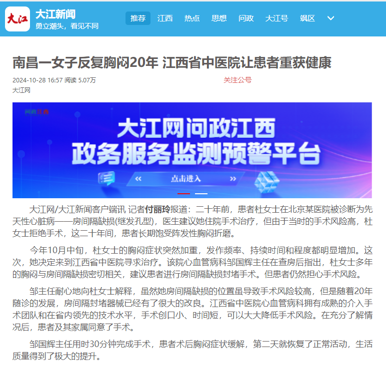 今年10月中旬,杜女士的胸闷症状突然加重,发作频率、持续时间和程度都明显增加。这次,她决定来到江西省中医院寻求治疗。该院心血管病科邹国辉主任在查房后指出,杜女士多年的胸闷与房间隔缺损密切相关,建议患者进行房间隔缺损封堵手术。但患者仍然担心手术风险。