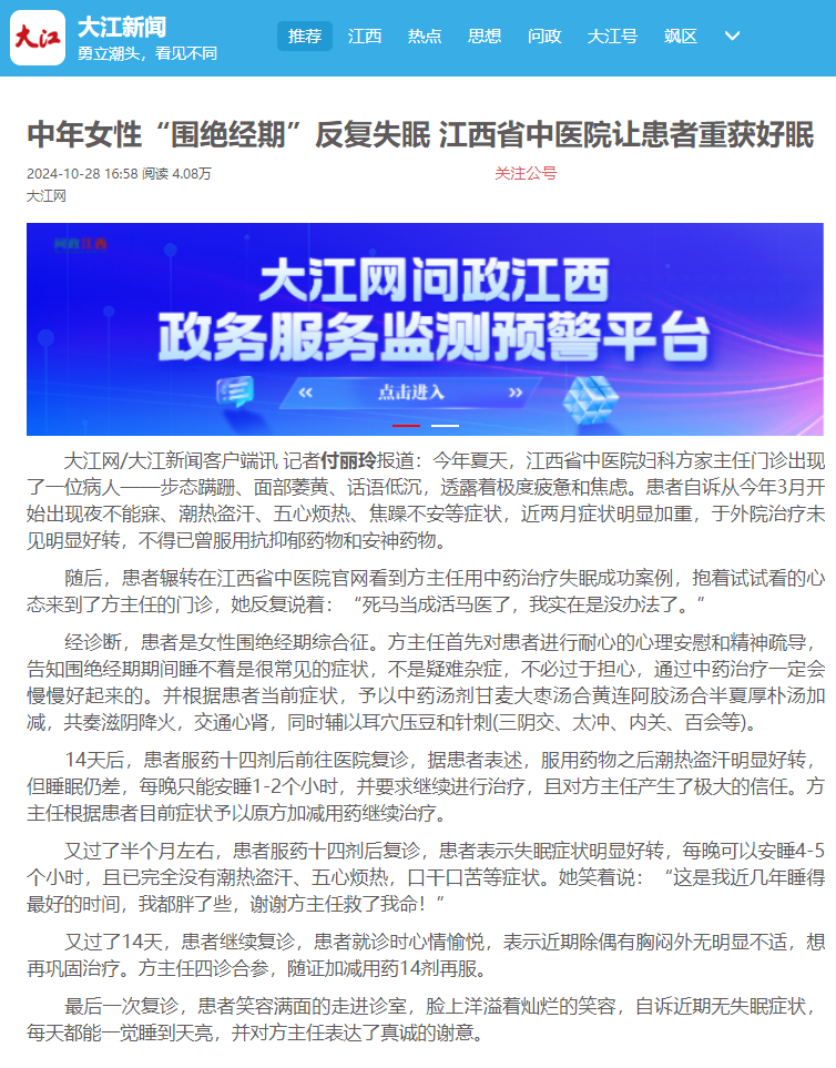 【大江网】中年女性“围绝经期”反复失眠 江西省中医院让患者重获好眠