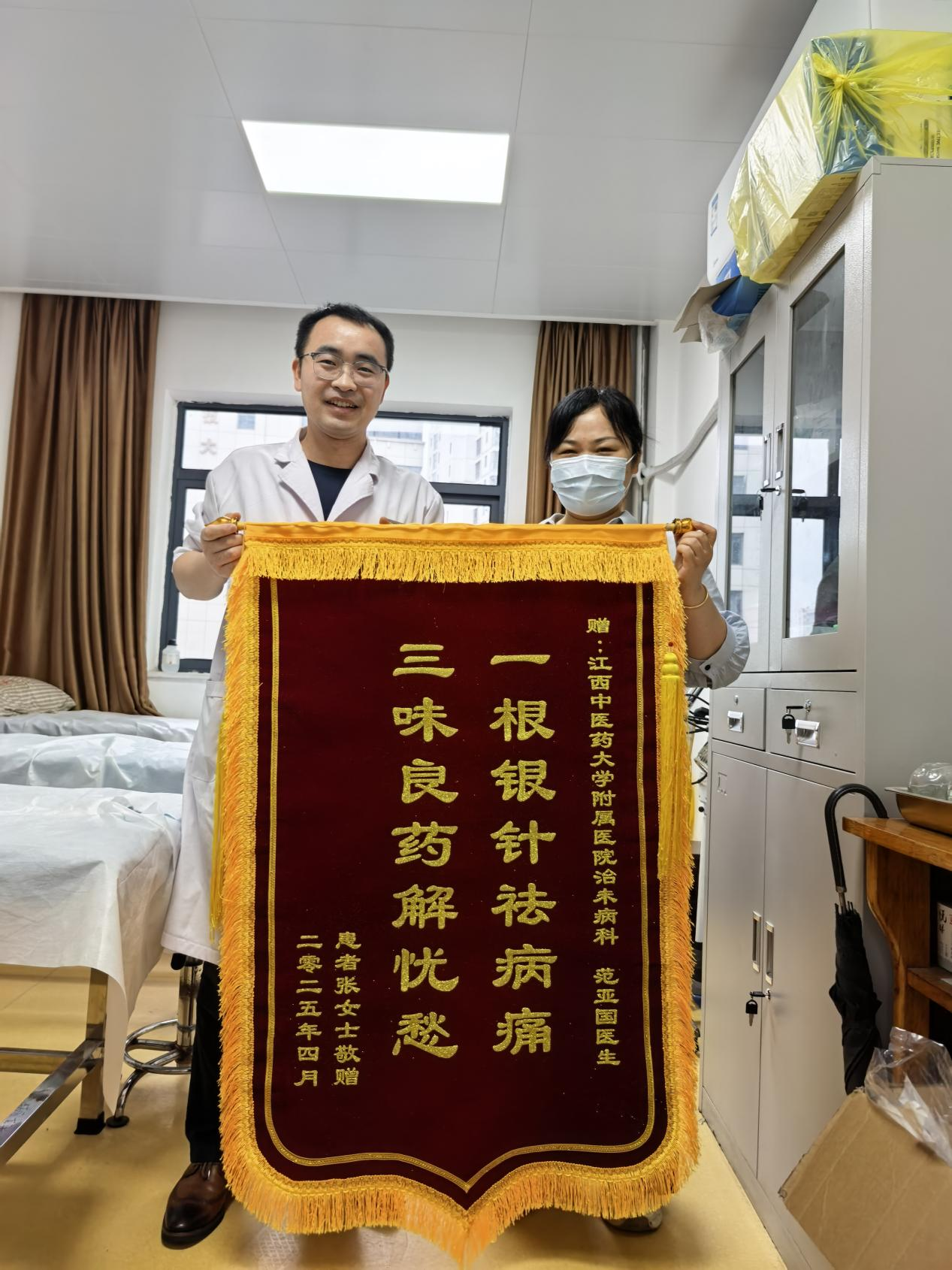 来到江西中医药大学附属医院就诊的患者,对医院以及医生保持绝对的信任,这份沉甸甸的信任,并非凭空而来。在治未病中心范亚国医生的诊室,38岁的患者张女士将一面绣着“一根银针祛病痛,三味良药解忧愁”的锦旗送到治未病中心,激动地握住范亚国医生的手连声道谢。