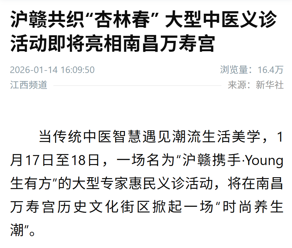 当传统中医智慧遇见潮流生活美学,1月17日至18日,一场名为“沪赣携手·Young生有方”的大型专家惠民义诊活动,将在南昌万寿宫历史文化街区掀起一场“时尚养生潮”。