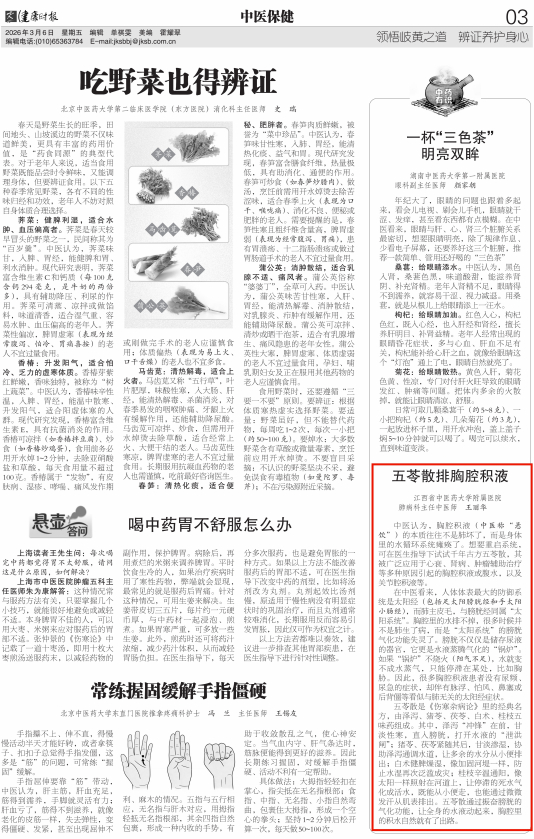 五苓散是《伤寒杂病论》丽的经典名方,由泽泻、猪苓、茯苓、白术、桂枝五味药组成,其中,泽泻“冲锋”在前,甘淡性寒,直入膀胱,打开水液的“泄洪闸”,猪苓。茯苓紧随其后,甘淡渗湿,协助泽泻通调水道,让多余的水分从小便排出;白术健脾燥湿,像加围河堤一样,防止水湿再次泛滥成灾;桂枝辛温通阳,像太阳一样照射在河道上,让停滞的死水气化,既能从小便走,也能通过微微发汗从肌表排出。五苓散通过振奋膀胱的气化功能,让全身的水液动起来,胸腔里的积水自然就有了出路。(王丽华)