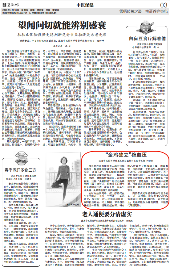 应对方法很简单,把上浮的气血引下去即可,介绍一个方法-金鸡独立。练习时,找一块平坦的地面,双脚自然站立;闭上眼睛,双手自然垂在身体两侧,缓缓抬起右脚,将右脚心放到左大腿内侧上端,脚趾朝下,保持平衡,之后换另一侧重复以上动作。闭着眼睛单腿站立时,为了保持身体不倒下,人的注意力会不自觉地集中在脚底。中医有个原理叫“意到气到”,意思是说,注意力集中在哪里,气血就会流向哪里。因此,金鸡独立时,原本往上冲的气血会慢慢降下来。
