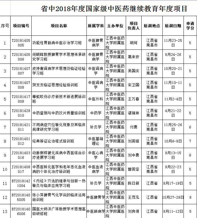 根据全国继续医学教育委员会《关于公布2018年第一批国家级继续医学教育项目的通知》(全继委办发(2017)13号),经全国继续医学教育委员会批准,我院共有3项列入2018年第一批国家级继续医学教育项目(见表1)。并根据国中医药继教委《国家中医药管理局中医药继续教育委员会关于公布2018年度国家级中医药继续教育项目的通知》(国中医药继教委发〔2018〕1号)文件精神,我院共有13项列入2018年度国家级中医药继续教育年度项目(见表2)。