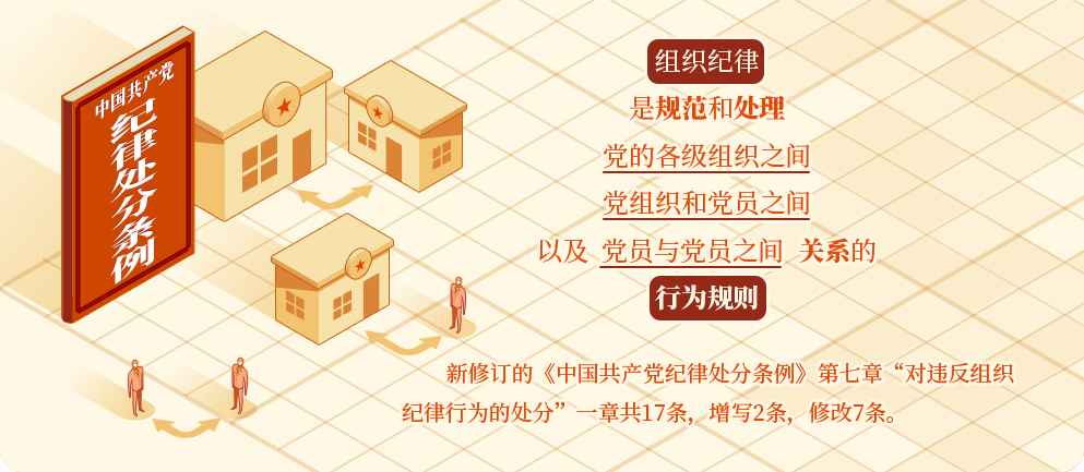 新修订的《中国共产党纪律处分条例》第七章“对违反组织纪律行为的处分”共17条,增写2条,修改7条。新增第八十条,对在党组织纪律审查中,依法依规负有作证义务的党员拒绝作证或者故意提供虚假情况,达到情节较重或者情节严重程度的,给予警告、严重警告直至开除党籍的处分;新增第八十五条,明确规定在推进领导干部能上能下工作中搞好人主义,存在以党纪政务等处分规避组织调整、以组织调整代替党纪政务等处分或者其他避重就轻作出处理行为的,视情节给予相应处分。在第八十六条增写对在授予学术称号中弄虚作假、违规谋利行为的处分规定,促进营造识才爱才敬才用才的良好氛围,为推动创新人才评价机制提供纪律保障;在第九十一条对党员虽经批准因私出国(境)但存在超出批准范围的行为作出处分规定;等等。