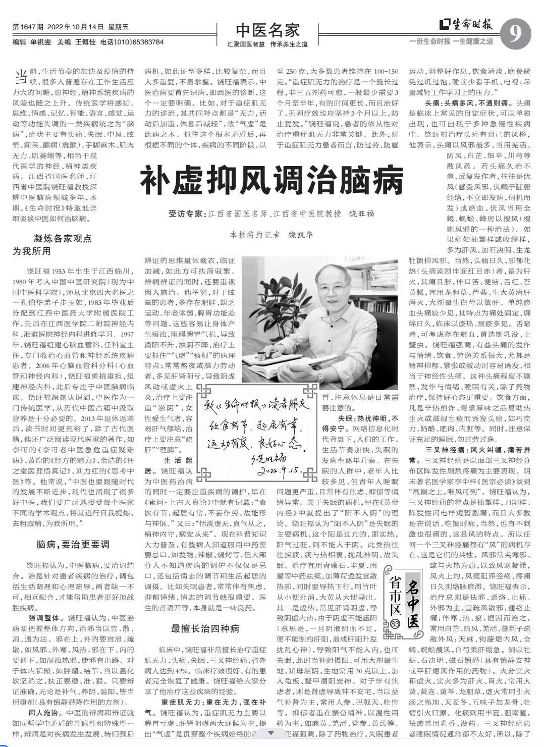 2022年10月14日《生命时报》中医名家专栏报道了全国名老中药专家、江西省国医名师、江西省名中医饶旺福教授补虚抑风调治脑病的学术思想。饶教授深耕中医脑病领域多年,对中医调治脑病有深厚造诣。