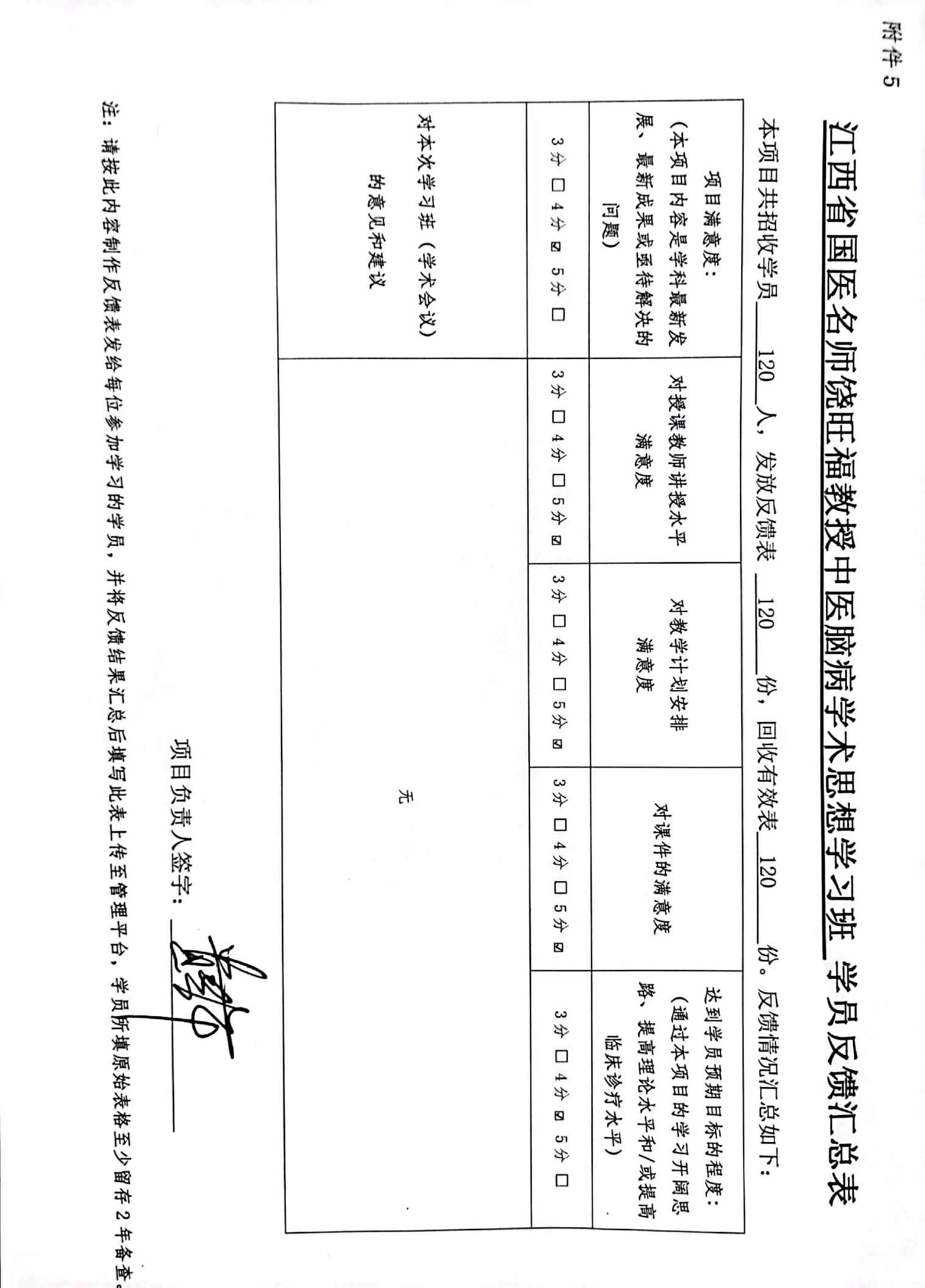 参加本次学习班的市、县、医生及研究生和规培生共约100余人,授予省级继续教育学分3分。通过本次学习班的召开,不仅提高了学员们中医脑病诊治的理论水平和实践能力,更重要的是提高了饶旺福老中医学术思想在本省的影响力,使饶旺福老中医的学术经验得以推广。另外,本次学习班从会议电子邀请函设计、会议流程、等方面都作了精心的统畴与安排,展现了我院脑病科及名医工作室团队的积极进取的精神面貌。