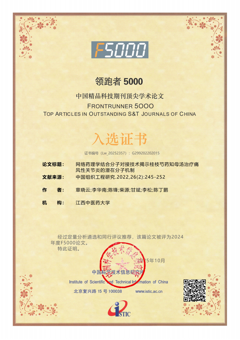 近日,国家科技部中国科学技术信息研究所(中信所)发布了2024年度“领跑者5000——中国精品科技期刊顶尖学术论文(F5000)”入选论文名单,我院李华南教授团队发表在《中国组织工程研究杂志》2022年第2期上的论文——《网络药理学结合分子对接技术揭示桂枝芍药知母汤治疗痛风性关节炎的潜在分子机制》正式入选。